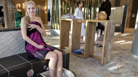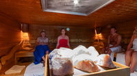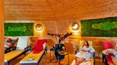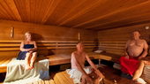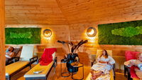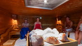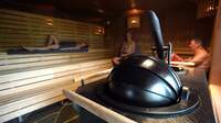Op de verwarmde banken van speciale keramiek is plaats voor negen personen, om comfortabel te kunnen zitten – en flink te zweten: en dat bij 100 procent luchtvochtigheid en een temperatuur van 50 à 55 graden Celsius. Pure ontspanning met onze stoombad-rituelen voor alle zintuigen. Pure gezondheid in de beide Kneippstations. Het highlight: nieuw beeldscherm boven de complete zitzone met een 270 graden videoweergave.
